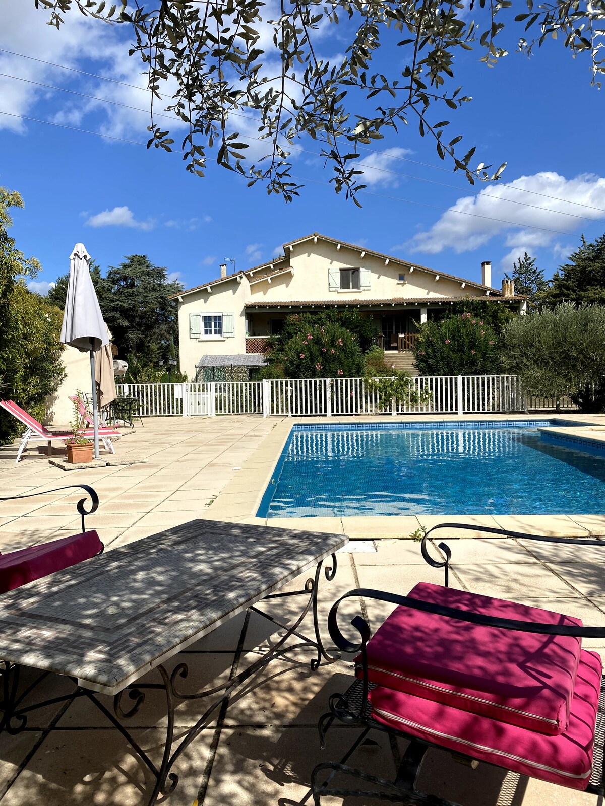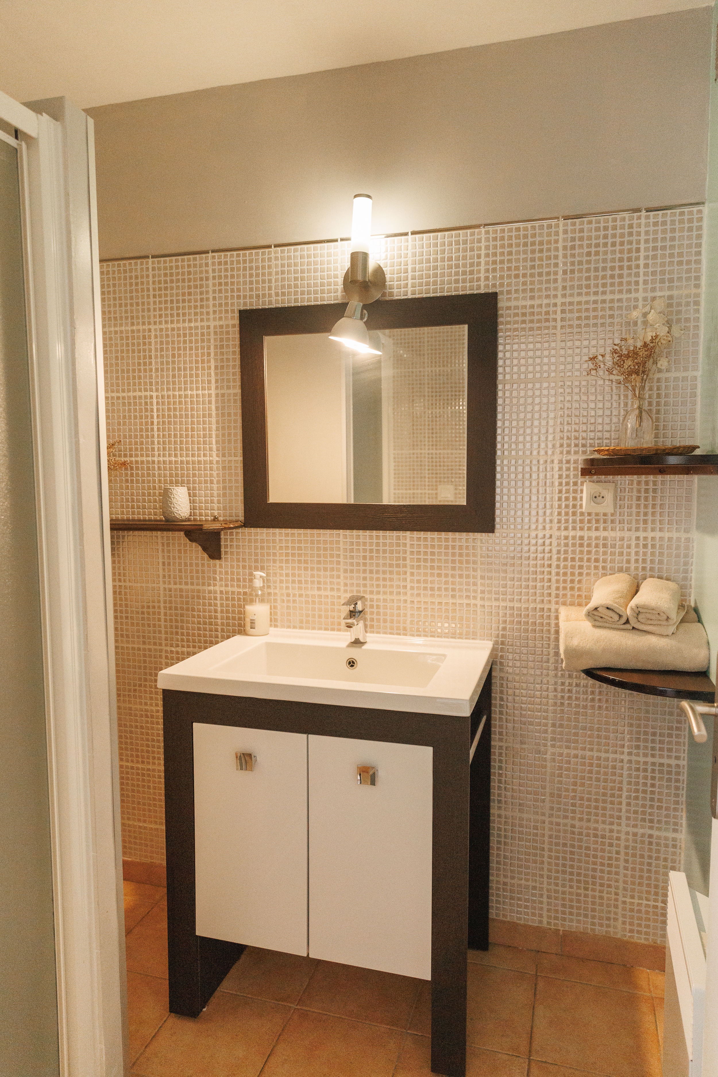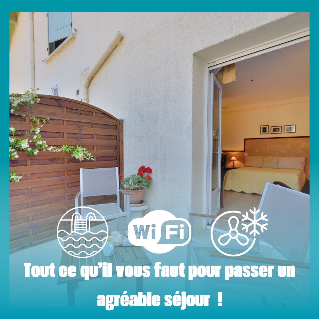 Chambre spacieuse (22 m² + terrasse) située au rez de chaussée, vue sur jardin. Equipées d'un petit réfrigérateur, d'un placard-penderie, d'une télévision à écran plat, d'une climatisation individuelle mixte hiver/été. Salle d'eau privée avec douche et meuble-lavabo, toilettes séparées. Entrée indépendante et kitchenette commune et buanderie à disposition. Piscine commune et jardin, piste de pétanque et parking privé.