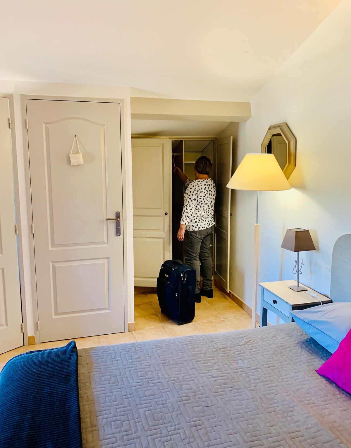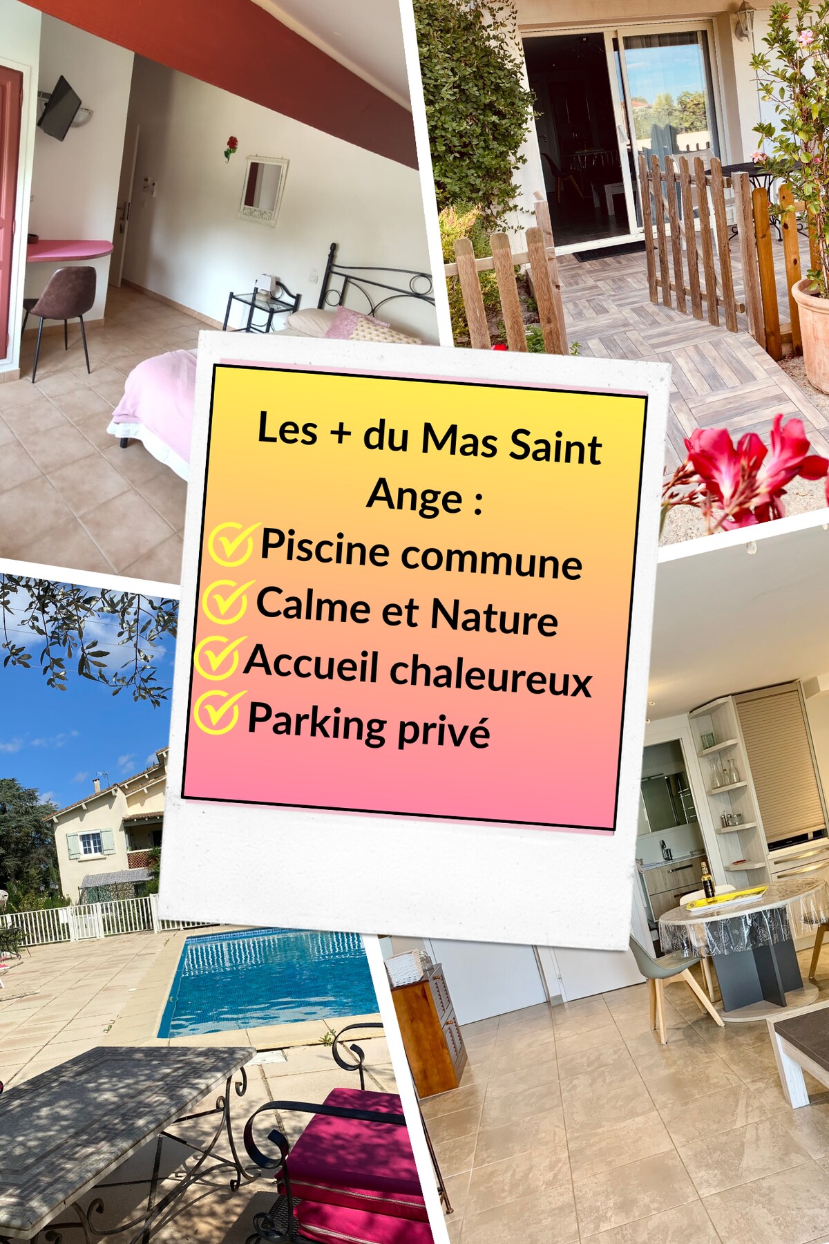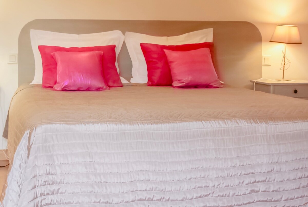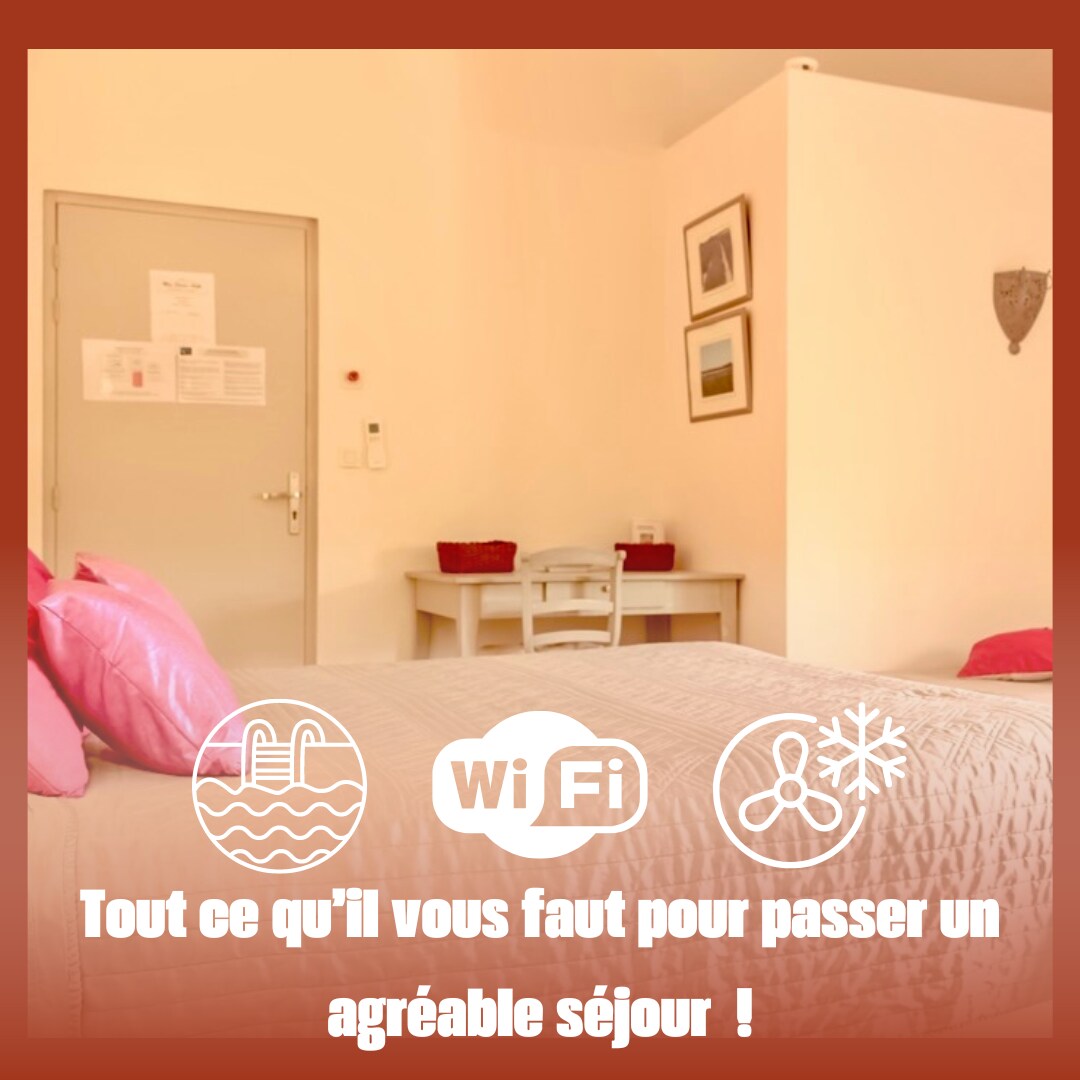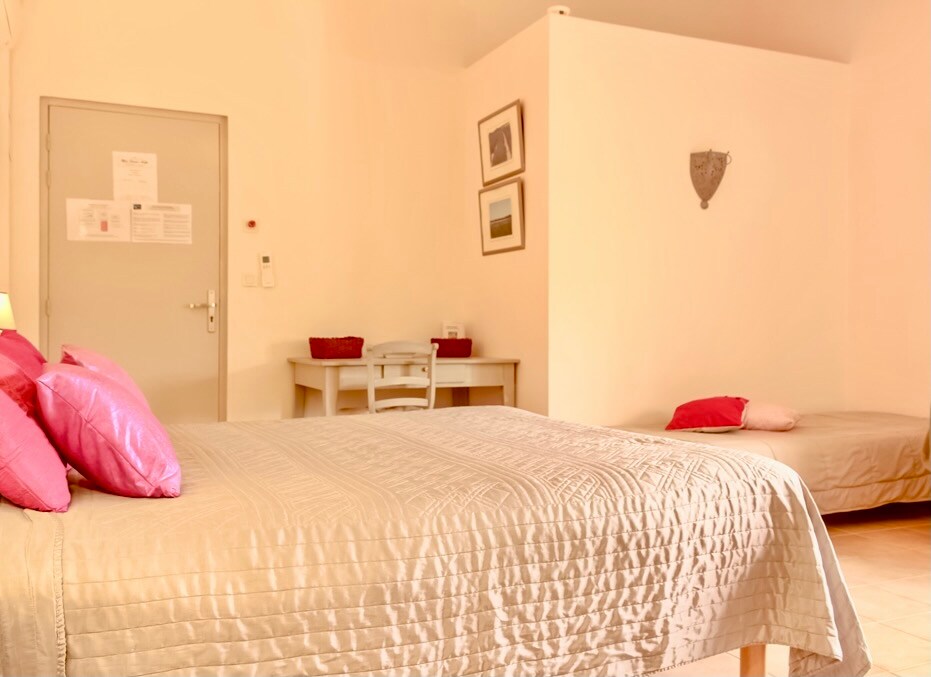 Chambre très spacieuse (30 m²) située au 2ème étage, vue sur jardin. Equipées d'un petit réfrigérateur, d'un placard-penderie, d'une télévision à écran plat, d'une climatisation individuelle mixte hiver/été. Salle d'eau privée avec douche et meuble-lavabo, toilettes séparées. Entrée indépendante et kitchenette commune et buanderie à disposition. Piscine commune, jardin, piste de pétanque et parking privé.