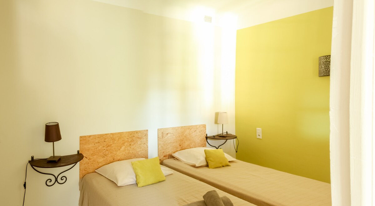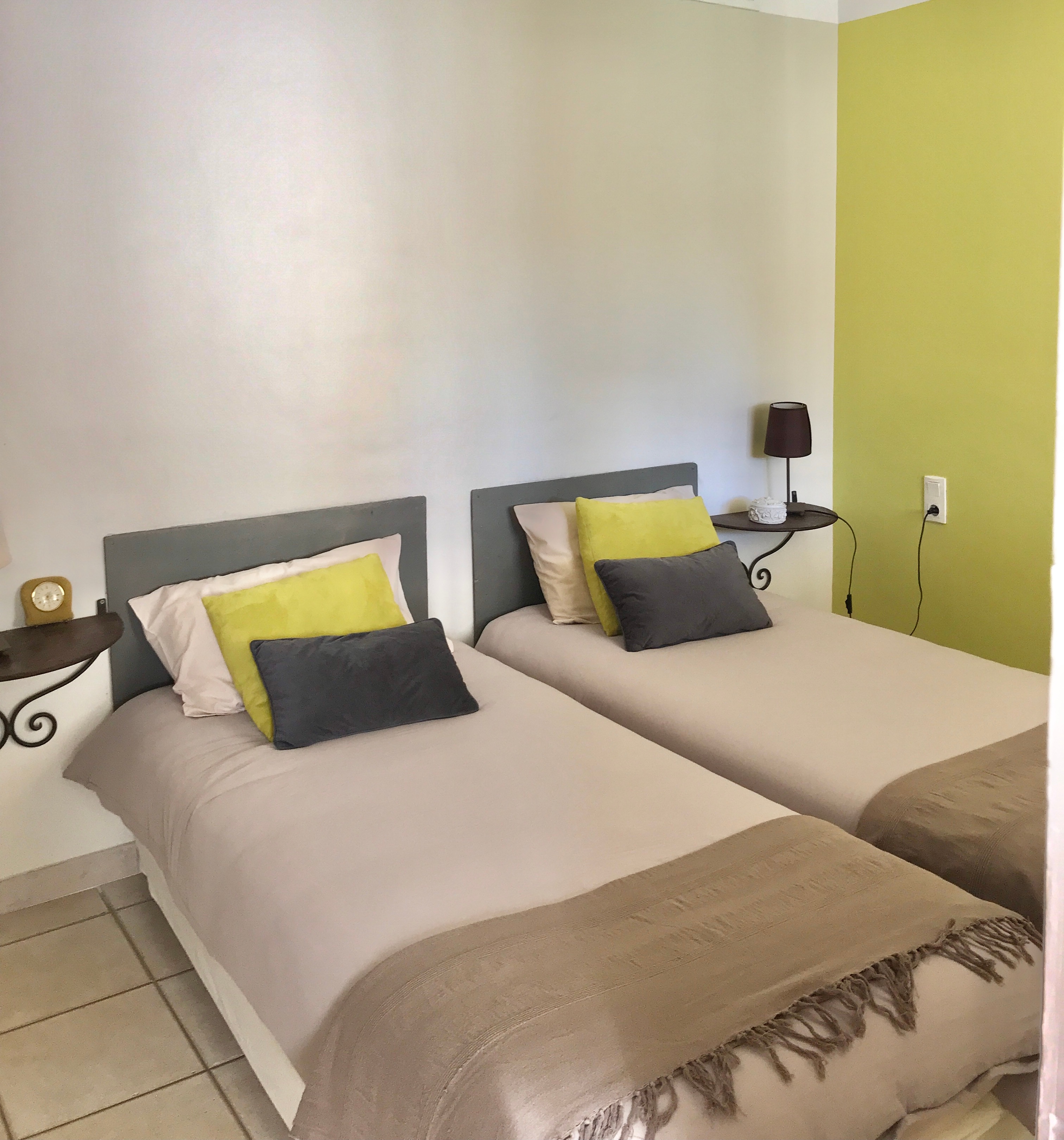 Entièrement équipé pour quatre personnes (meublé de tourisme classé 3 étoiles), ce gîte de 55 m² est situé au rez de chaussée du Mas, côté piscine (orientation sud).